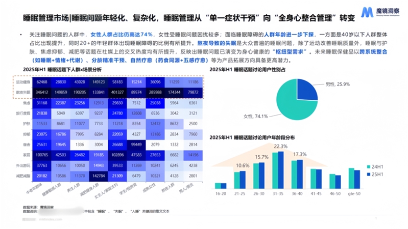 關(guān)注睡眠問題的人群中,女性人群占比仍高達(dá)74%,女性受睡眠問題困擾較多;面臨睡眠障礙的人群年齡進(jìn)一步下探,一方面是40歲以下人群整體占比出現(xiàn)提升,同時20+的年輕群體出現(xiàn)睡眠障礙的比例有所提升。熬夜導(dǎo)致的失眠是大眾普遍的睡眠問題,除了運動改善睡眠質(zhì)量外,睡眠與護(hù)膚、焦慮抑郁、減肥等話題在社媒上的交叉熱度均有所提升,反映出睡眠問題已演變?yōu)樯硇慕】档?ldquo;樞紐型需求”。未來睡眠保健品以跨系統(tǒng)整合(如睡眠+情緒+代謝)、分齡精準(zhǔn)干預(yù)、自然療愈(藥食同源+五感療愈)等為產(chǎn)品拓展方向具備更高潛力。