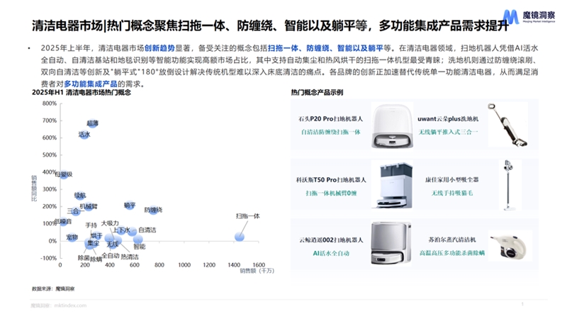 清潔電器市場創(chuàng)新趨勢顯著,備受關(guān)注的概念包括掃拖一體、防纏繞、智能以及躺平等。在清潔電器領(lǐng)域,掃地機(jī)器人憑借AI活水全自動、自清潔基站和地毯識別等智能功能實現(xiàn)高額市場占比,其中支持自動集塵和熱風(fēng)烘干的掃拖一體機(jī)型最受青睞;洗地機(jī)則通過防纏繞滾刷、雙向自清潔等創(chuàng)新及"躺平式"180°放倒設(shè)計解決傳統(tǒng)機(jī)型難以深入床底清潔的痛點。
