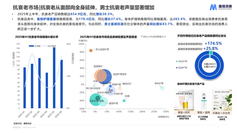 抗衰品類中,面部護(hù)理套裝銷售額居首,為178.4億元,同比增長37.6%。身體護(hù)理銷售額同比增幅最高,達(dá)283.9%,該數(shù)據(jù)反映出消費者抗衰需求從面部向身體延伸,對全身抗衰的重視度提升。與此同時,男士面部抗衰在社交媒體的聲量同比增長83.7%,表現(xiàn)突出,反映出抗衰功效的消費人群正進(jìn)一步擴(kuò)大。